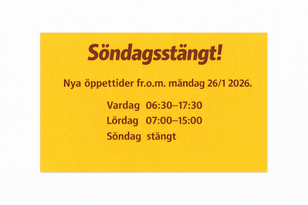 Söndag stängtObservera att fr.o.m. den 26 januari har vi nya öppettider,m se ovan.