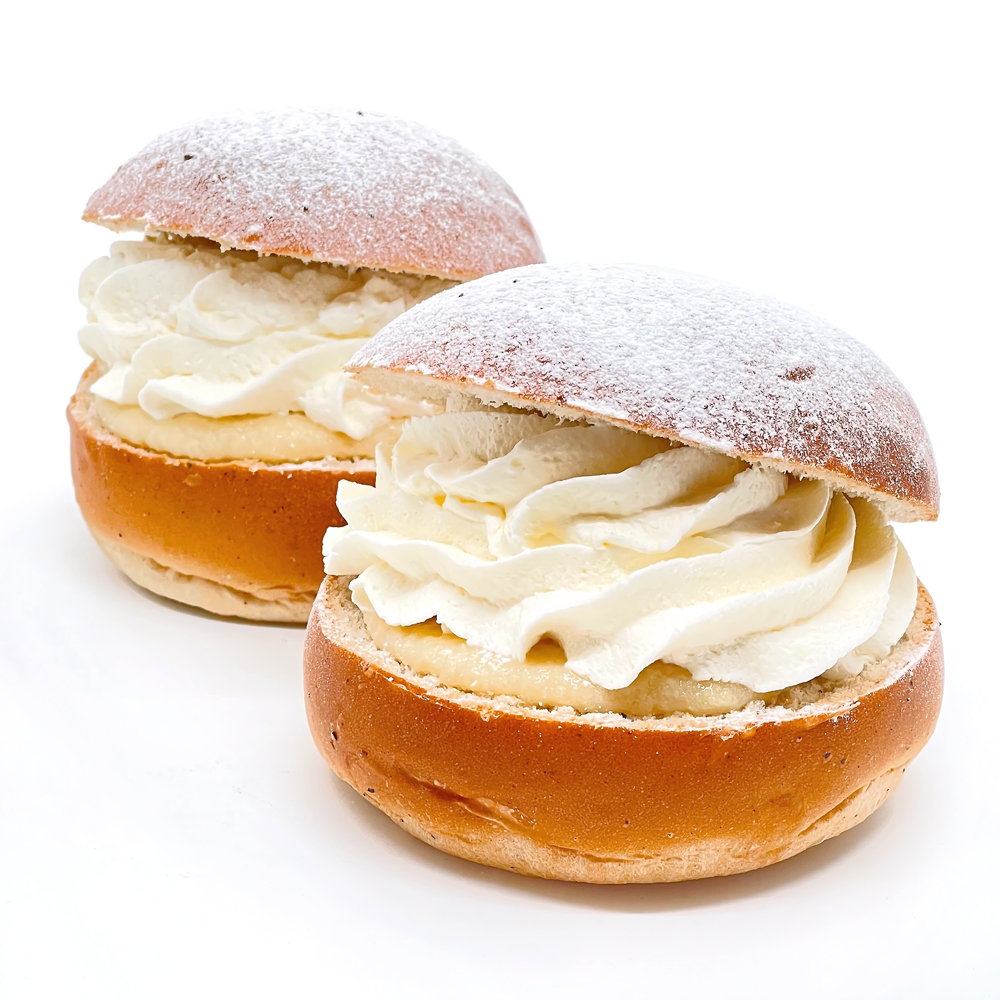 Vetebulle med kardemumma, semlefyllning och vispgrädde.